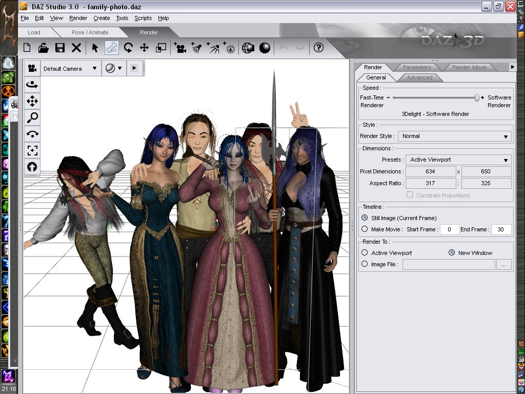 Notes: Apparently I can't render stuff with more than five figures in it, because I run out of RAM. Sucks to be me. So, here's a screencap of what I just stopped working on, because I'll never be able to finish it. It should have ended up with no less than eleven people in it, but I stopped at six, when the render errors got nasty enough to force a reboot.