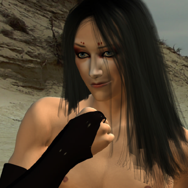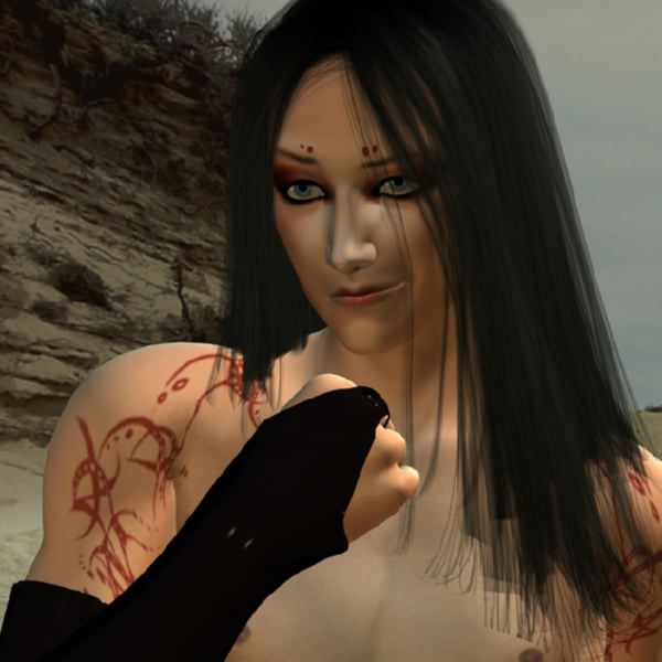 Different angle, same face, different chest. Fixed the shoulders. I'm not sure about this hair, because there's not really a way to control the angle near the ends — or really, anywhere more than about an inch from the scalp, and even that only works on both sides at the same time.