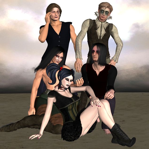 Notes: VICTORY IS MINE! I managed to get one frame with all five of them in it. I adjusted the poses and expressions, went to render it again, and crashed. But, hey, one frame is way better than no frames. Some post-work, but I'm a lazy git.