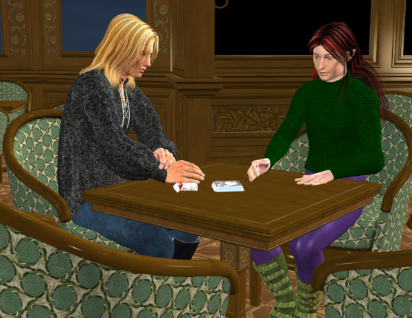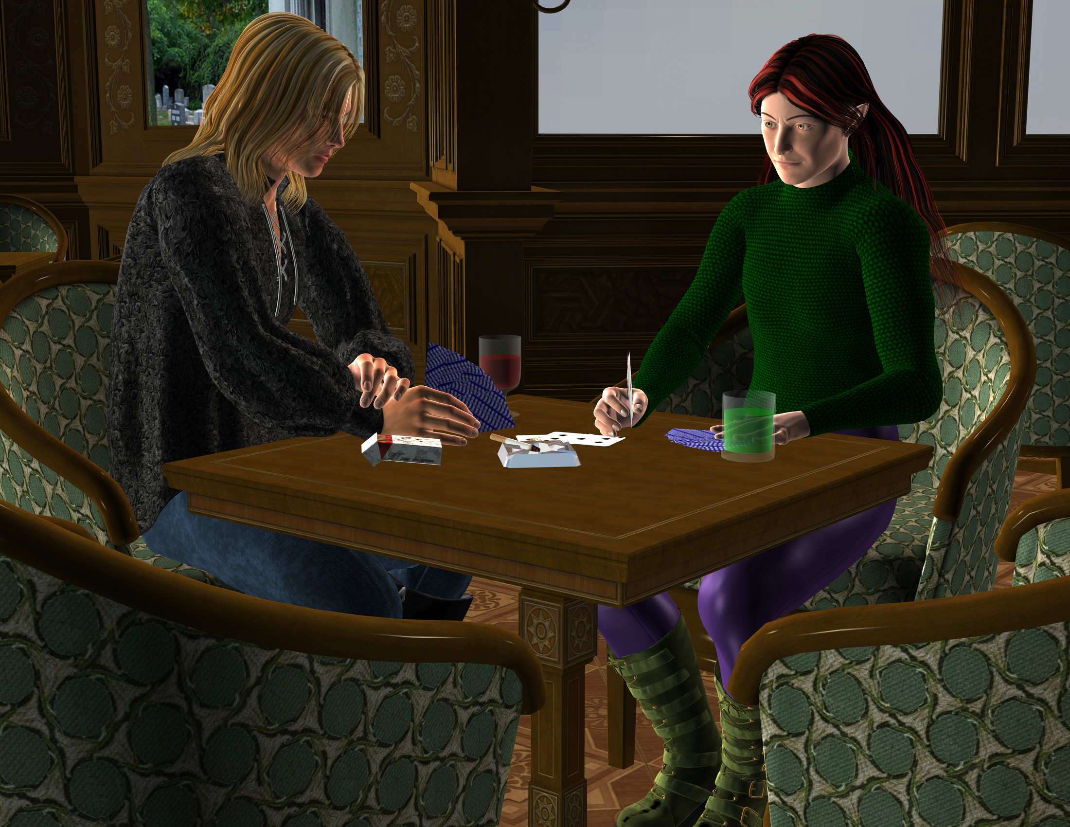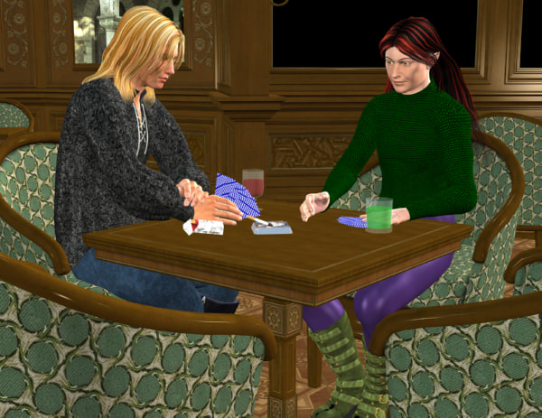 Notes: I wanted to do a calendar page that was Dark and Ice, and still have something relatively PG, which wouldn't have worked with Dark smoking opium, which was my other idea. So, instead, you get them playing cribbage. Sort of. I still haven't got a board or the rest of the deck on the table. Currently trying to work out some lighting problems, as the default lights for this room are for segments of the room, and I can only load one at a time, and I can't figure out which one actually lights the part I'm shooting. *laughs*