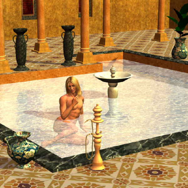 Notes:Â Not much to say about this one. I'd been looking for an excuse to use Dark and that set in the same image, since I first saw the set. Unfortunately, the native textures for the water and the hookah kind of suck, so I ended up using Sha's gold shader (which is the only viable gold shader I've found, despite having like four) and this awesome tutorial on making water that doesn't suck. And despite the fact that no one is smoking anything in that hookah, at the mo, I'm thinking the look on Dark's face says 'I could be significantly more stoned, with very little effort'.