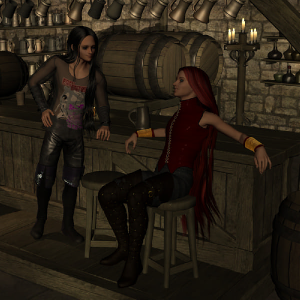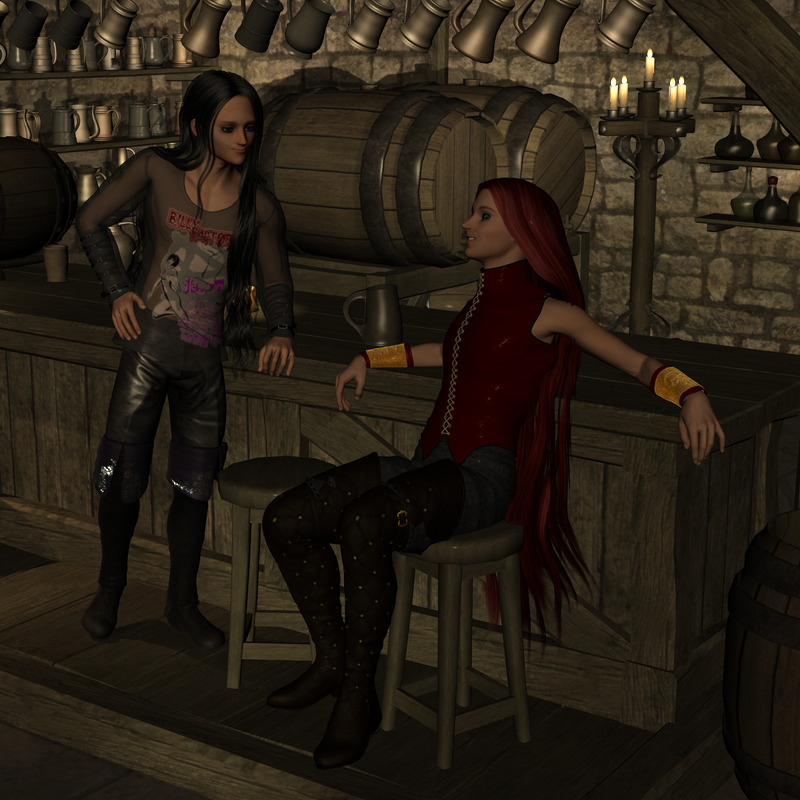 Notes: There has always been something wrong with this set's textures and lights, but I keep coming back to it, because it has such potential to be really beautiful, if I could just figure out what the fuck is wrong with it. Orion and Roddy having a drink at the pub by the Freehold. Orion is not in the habit of believing his dad's wild stories about the late 70s. Unfortunately for him, they're true.