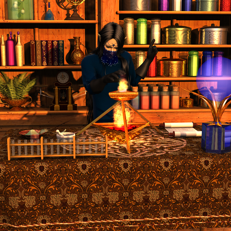 Notes: If I shoot this for wall-hanging size, I think I'll do it in 4×5 instead of square. The really ugly parts are toward the outer edges, in the back, but so's some of the really nice stuff, so… I can rearrange things. This is an example of what you're supposed to do with raytracing. Yes, that puff of smoke is actually reflected in three of the cans on the shelf. I've never gotten anything I didn't mean to be a mirror to do that, before, and it's awesome.