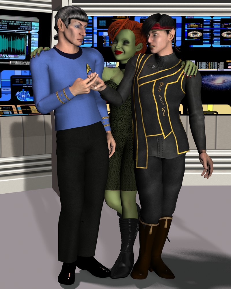 Notes: I love Starek's face in this. He looks like he's going to barf. "Oh, what? Are we really doing this? Are we really doing this on subspace? Fffff… They're going to kill my parents. Are you sure my face is blurred out? Really?" And Larue's all, "Don't worry, honey, if he throws up on your uniform, I'll get the drycleaning." But really, I've half-finished like three or four things, and everything looks like ass, including this, but at least this I can write off as 'starships have shitty lighting anyway'.