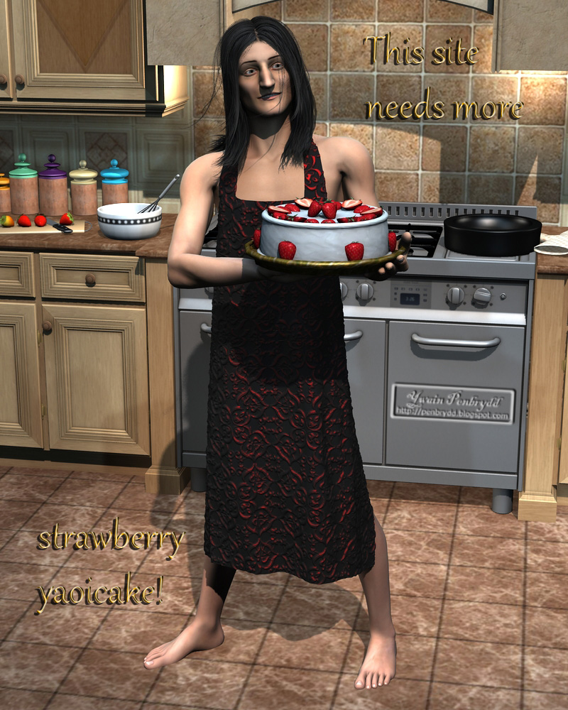 lyiint and I came to the conclusion that a grand celebration should be held, after the final server swap, and that it should include cake and margaritas, and that the cake — the yaoicake — should be baked and served by a rock star wearing nothing but an apron. Hey, I needed a good test render…