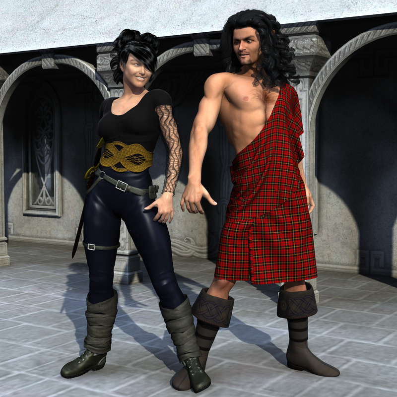 Notes: Actually, I'm lying through my teeth. That's not a greatkilt, it's a dirty hackjob. Doesn't look too horrible, even if it is the wrong cloth weight and it doesn't drape quite right… Also, her teeth are too bright and his hair is a little plasticky. Murphy and Maitiu are a pair of Sidhe warriors, sister and brother. She likes night raids, and he loves setting towns on fire. Recently, she's gotten much more practical and solution-oriented, and he's gotten a whole lot whinier.