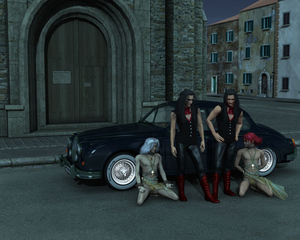 Sargantas wanted a limousine in these shots, but the only limo I could lay hands to was this 1936 model, which is pretty posh, if a little anachronistic. (I have been corrected. It is a 1959 model, and there is some debate about whether it is a limo, since the model maker identifies it as one. It's definitely not stretch.) Retextured most of it with some awesome car paint shaders I had laying around. I probably need to re-do the interior, as well, before I do #3. I'm debating whether the scene is too light, but I've recently got some crit that I shoot too dark for print, so I might just keep these light, for now. It looks like I can shoot two figures at a time, on this set, before things start exploding, which is good to know before I start building a scene. *laughs* Also, Cilea for V4 converts really well to M4/H4 as demonstrated by the kneeling pair. I probably want to re-texture the metal parts, so they don't glow in the dark, but it looks pretty good, aside from that.