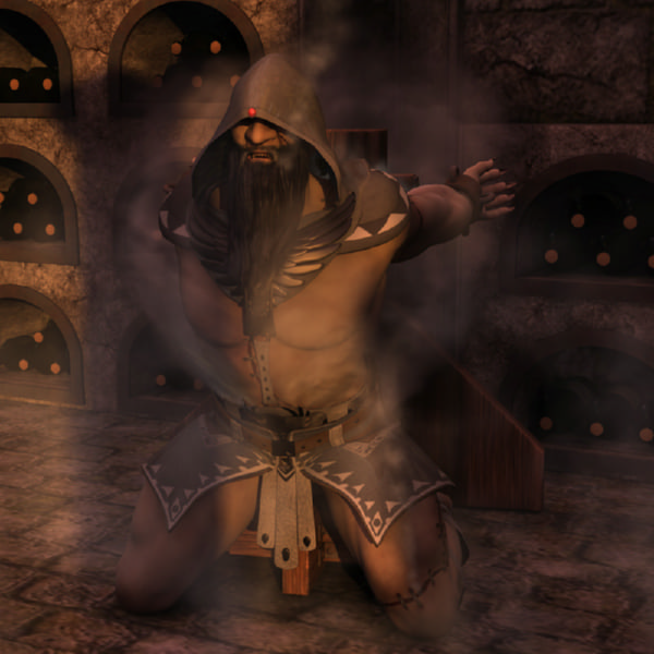 Notes: So, the Brute was an obvious second, when I finished the Bride, but he was sort of conceptually difficult. There are several well-described incarnations of him, and none of them went together quite as I intended. He's sort of come together as a mix and match of all of them… the smokey beard, the restraints, the beastly claws and teeth, the sewn-up skin. I couldn't find a full-face hood (is it just me, or does he look kind of like a chained-up Klansman in the wiki pics where he's hooded?) but I found one that shielded his eyes. I kind of like the Hierophant outfit on him, even if I did have to hand-resize all the damn parts, because it doesn't do Freak morphs. I called him frankendwarf in the warnings, but he's probably seven feet tall. He's just… well, once you see his face, you'll understand. Why a wine cellar? Because I have the same sick sense of humour most of us do, and keeping him chained beside the Cabernet, seemed a perfectly appropriate application of derangement.
