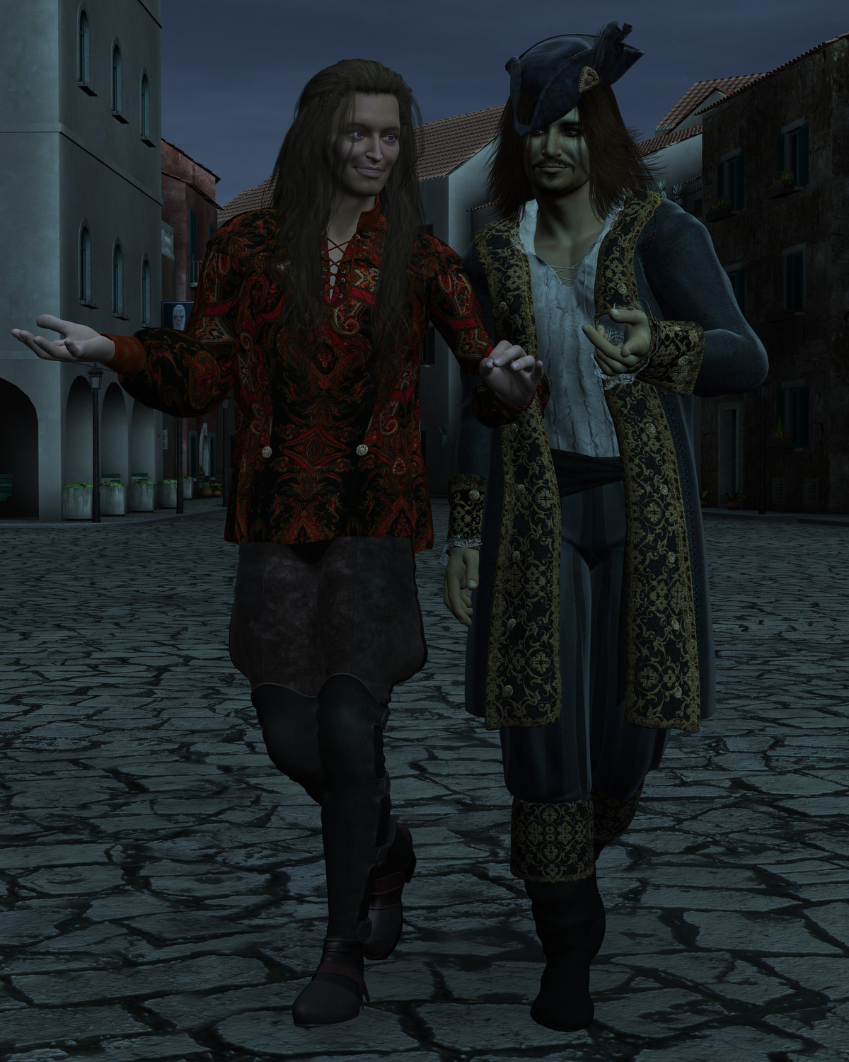 Notes: Two French vampires having a bit of a laugh in the road, just before daybreak. Kerrith is a few centuries older, as I recall, and a whole lot less emotive, despite the broad smile, here. Jehan is a bit more outré, distinctly flamboyant, a swaggering fabulist who fancies himself the next Cyrano. Also, I wish to hell Picasa wold stop autocorrecting the colour balance and brightness on my images, because this was darker, and Jehan wasn't GREEN. :|