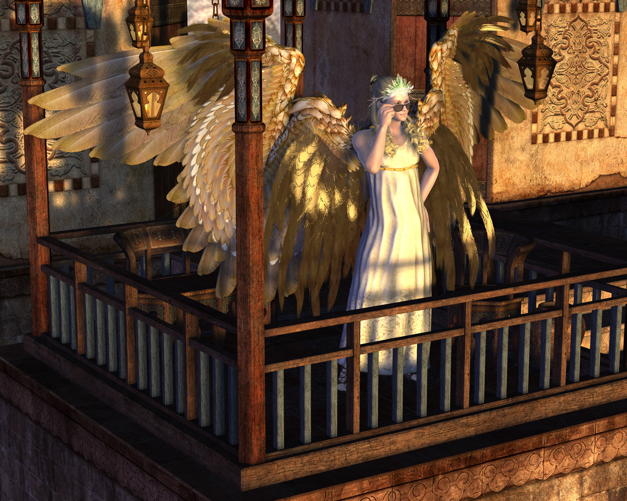 Notes: It's a test, so there's no post. It just came out really well. Details of this particular interpretation of this particular angel can be found below the cut, quoted straight from the fic I haven't finished writing. (And really, I just needed an excuse to work on that pair of wings, which is the base for the wings that will show up in my next commission piece — in a less shiny form.)