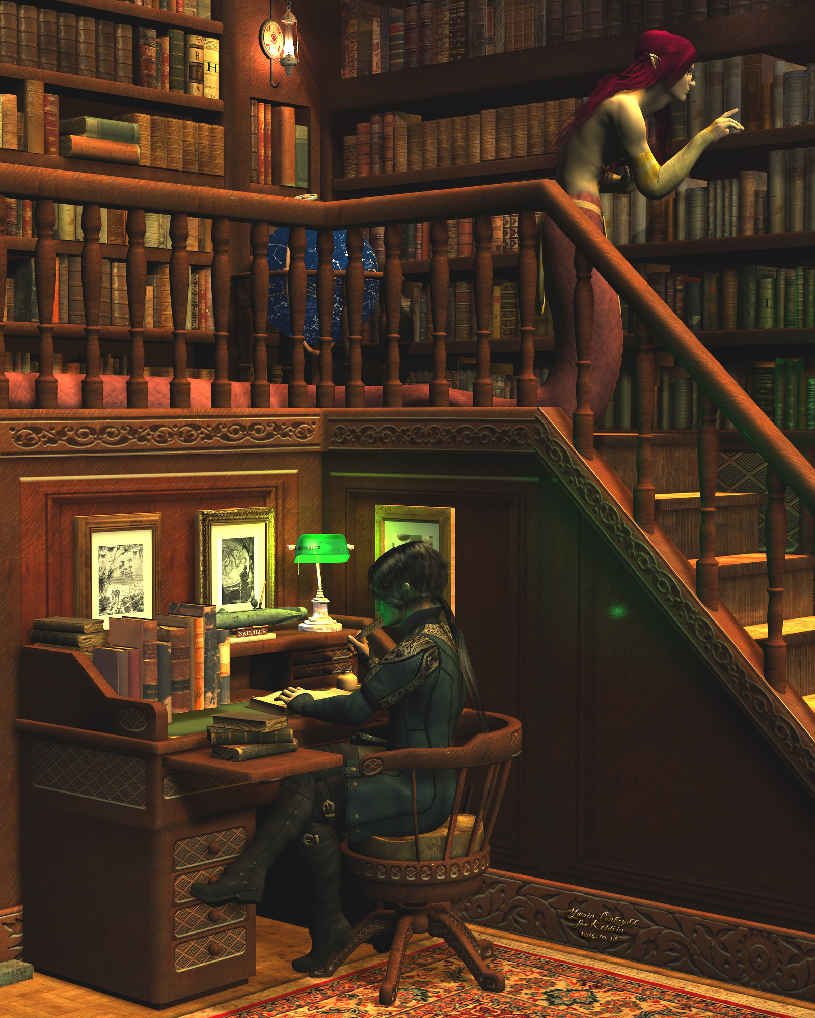 Keldrin & Ookz. Two guys in a library. This might be a little dark, but I'm willing to fix that, if needed.