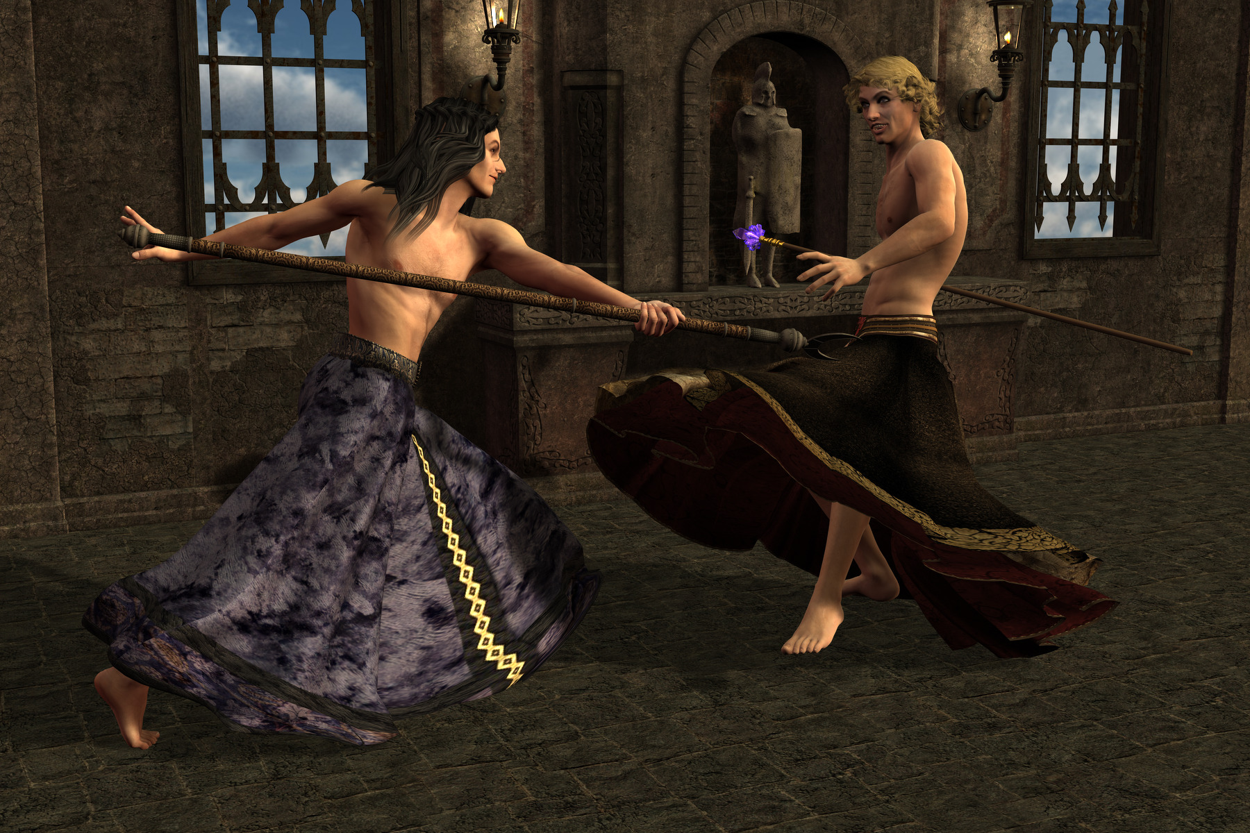 Warnings: Shirtless staff fight
