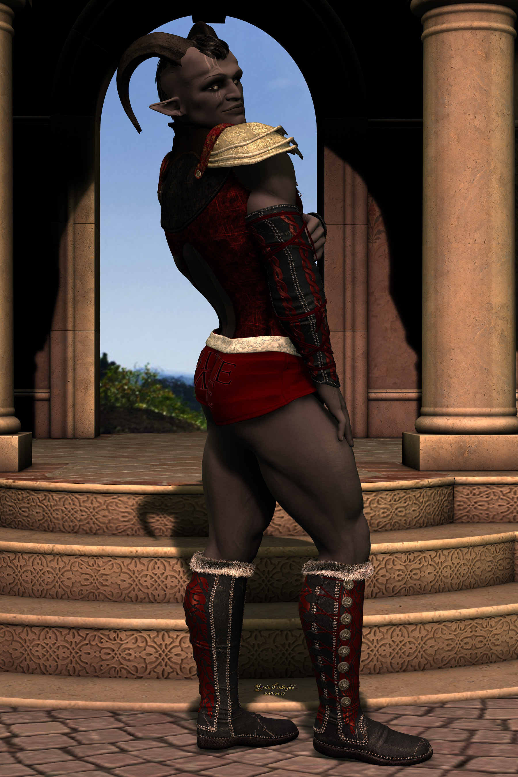 maverlok's Adaar, after a discussion in which it was decided that if he had booty shorts, they'd say 'Bite Me'. Unfortunately this is a terrible fucking angle, and I'm going to have to do it AGAIN. expect more of the same