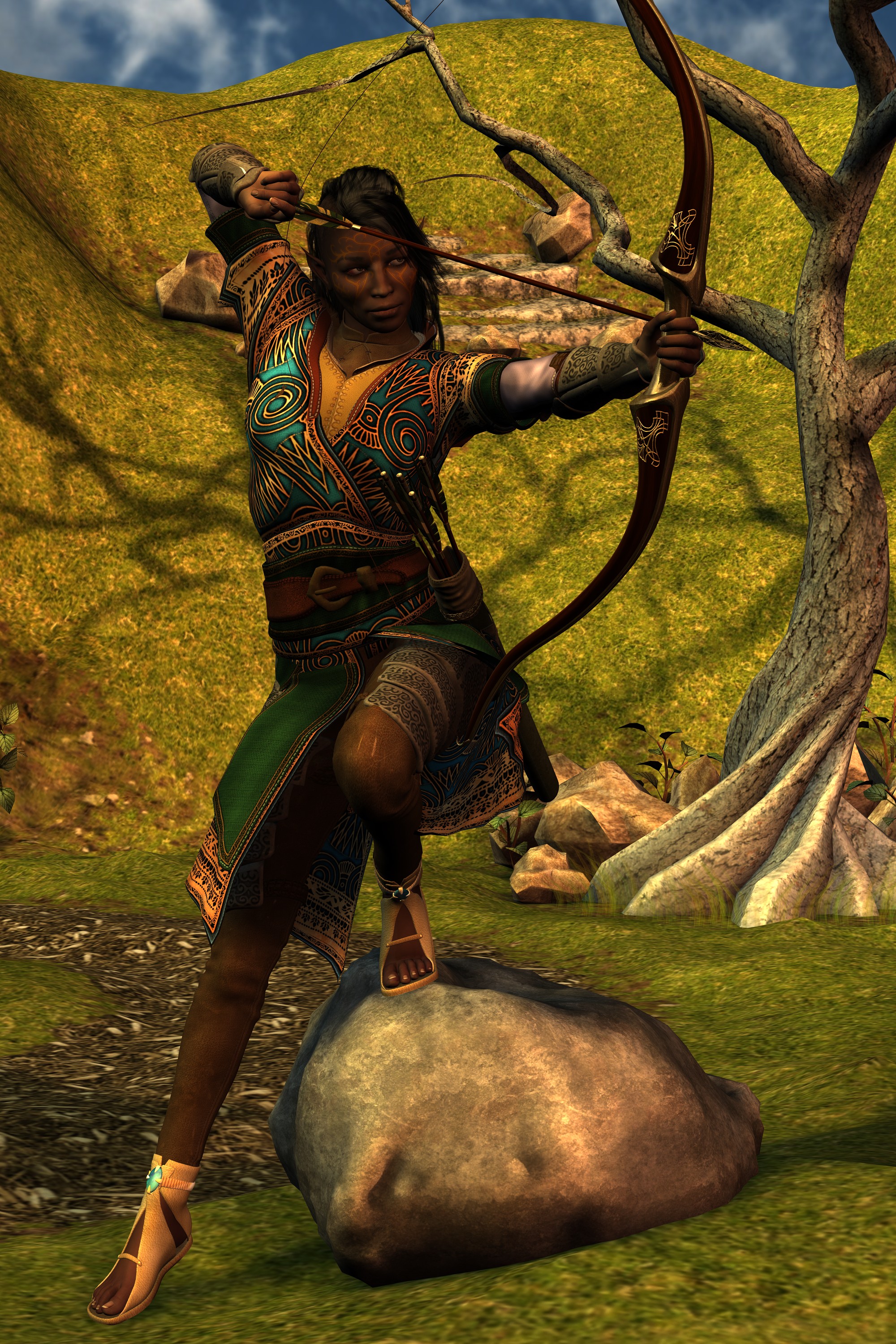 Notes: So, in writing Rhapsody, we've got a handful of characters who are fairly minor, but they come into play when we need somebody to do a Specific Thing that is their jam. And we've just started another scene with Ellana Lavellan, and realised it was probably time to make a reference image for her. It's a test shot, so no post, and I know there's clipping and the displacement's fucked up, but like… that's a concern for when I'm actually required to give a shit. The important thing here is that she has a face and a style.