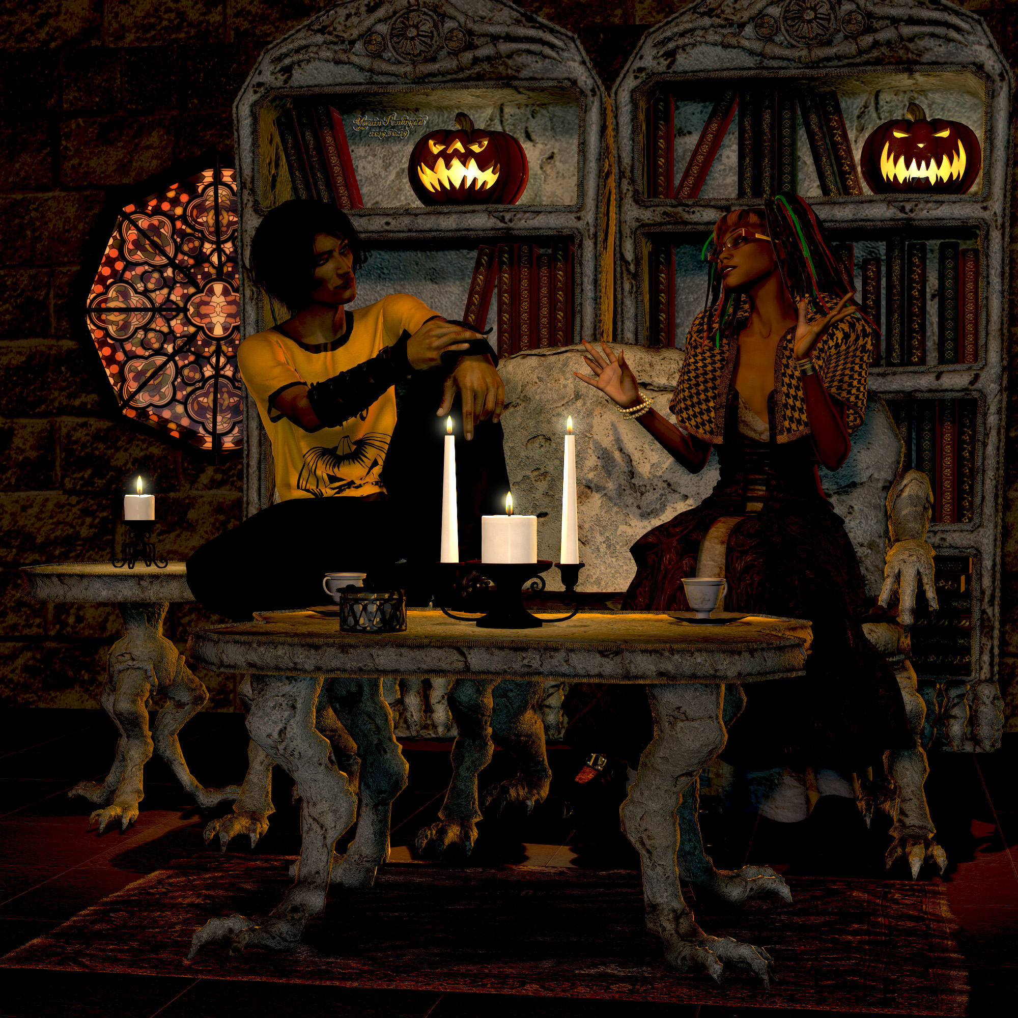 Notes: Tripped over this furniture while sorting my content library, and had to do something with it. Chaz and Hafs in exactly the kind of coffee shop you'd have found me in fifteen years ago. (And you can't read it because his arm's in the way, but that shirt reads 'Pumpkin King'.)