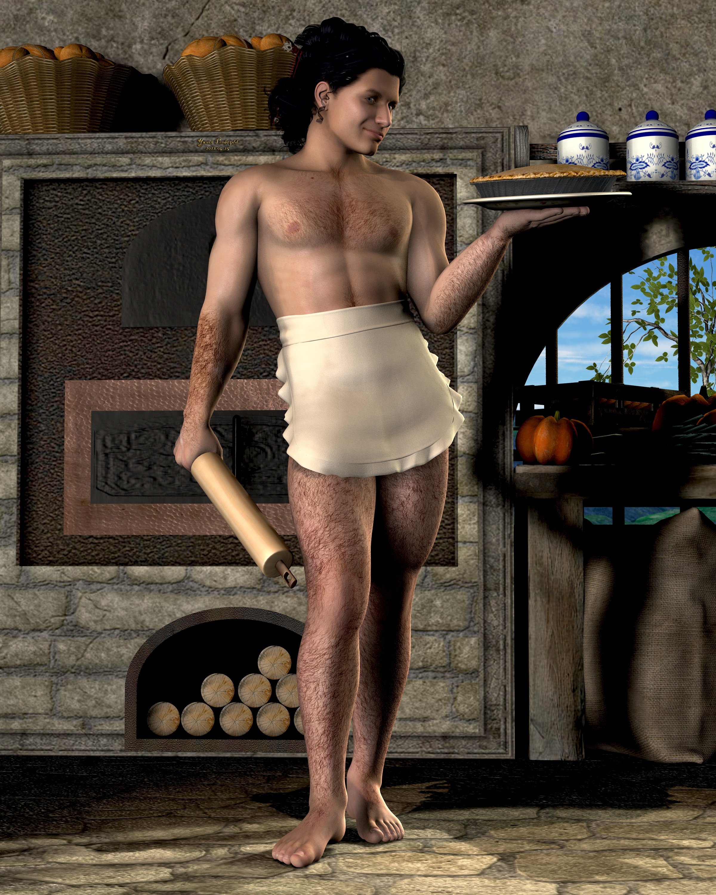 Notes: Weirdly, this one started as one of those barbarian book cover poses, but I swapped a rolling pin for the sword and a pie for the skull, and everything got weird from there on in. Still feeling like the background sucks, though.