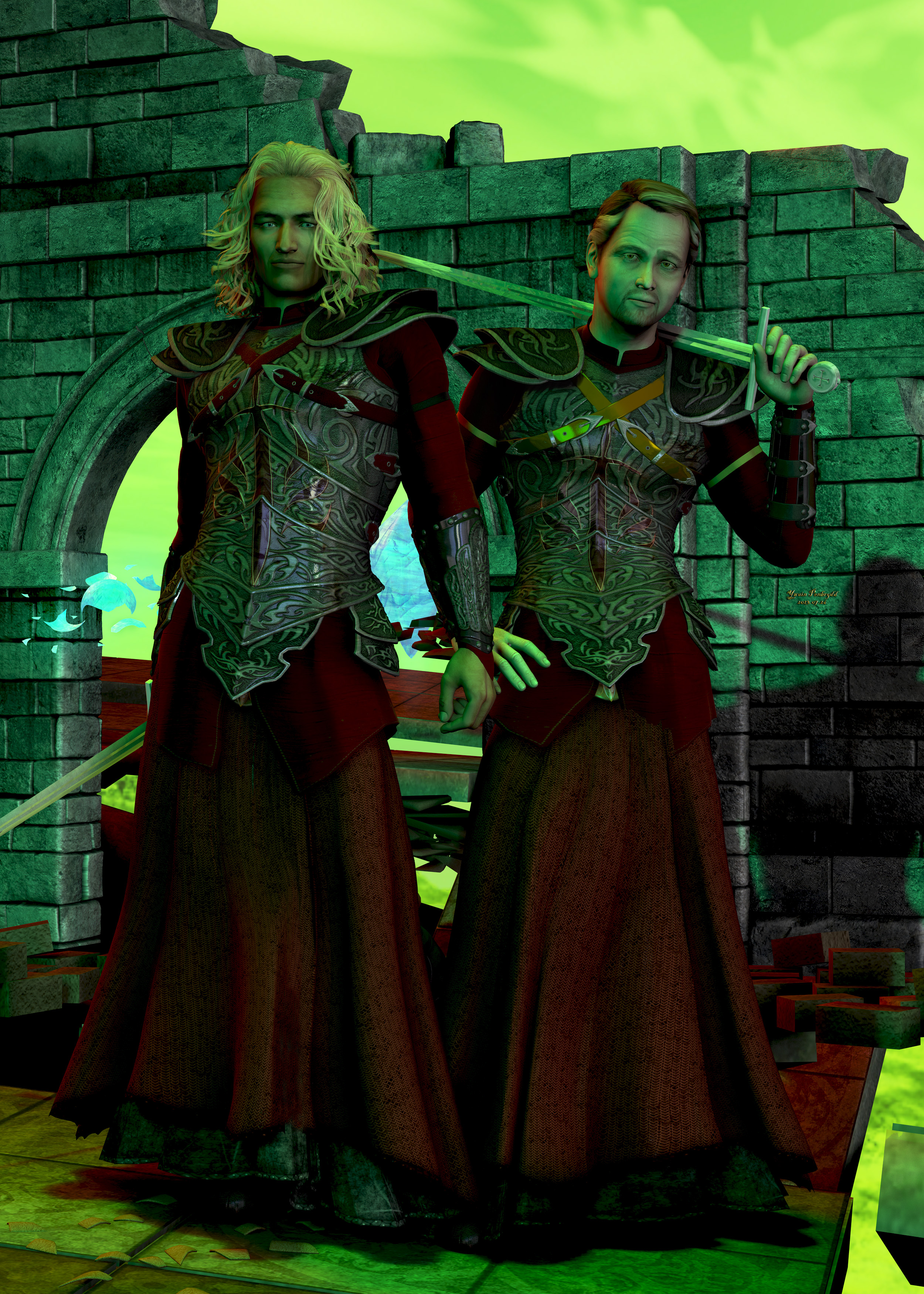 Notes: Knight-Lieutenant Owain and Knight-Captain Brynn, after a certain Extremely Cursed Mage attempted a rescue by summoning geese, and instead punted everyone in the building directly into the Fade. Brynn is so tired of this shit. Owain is almost willing to adventure.