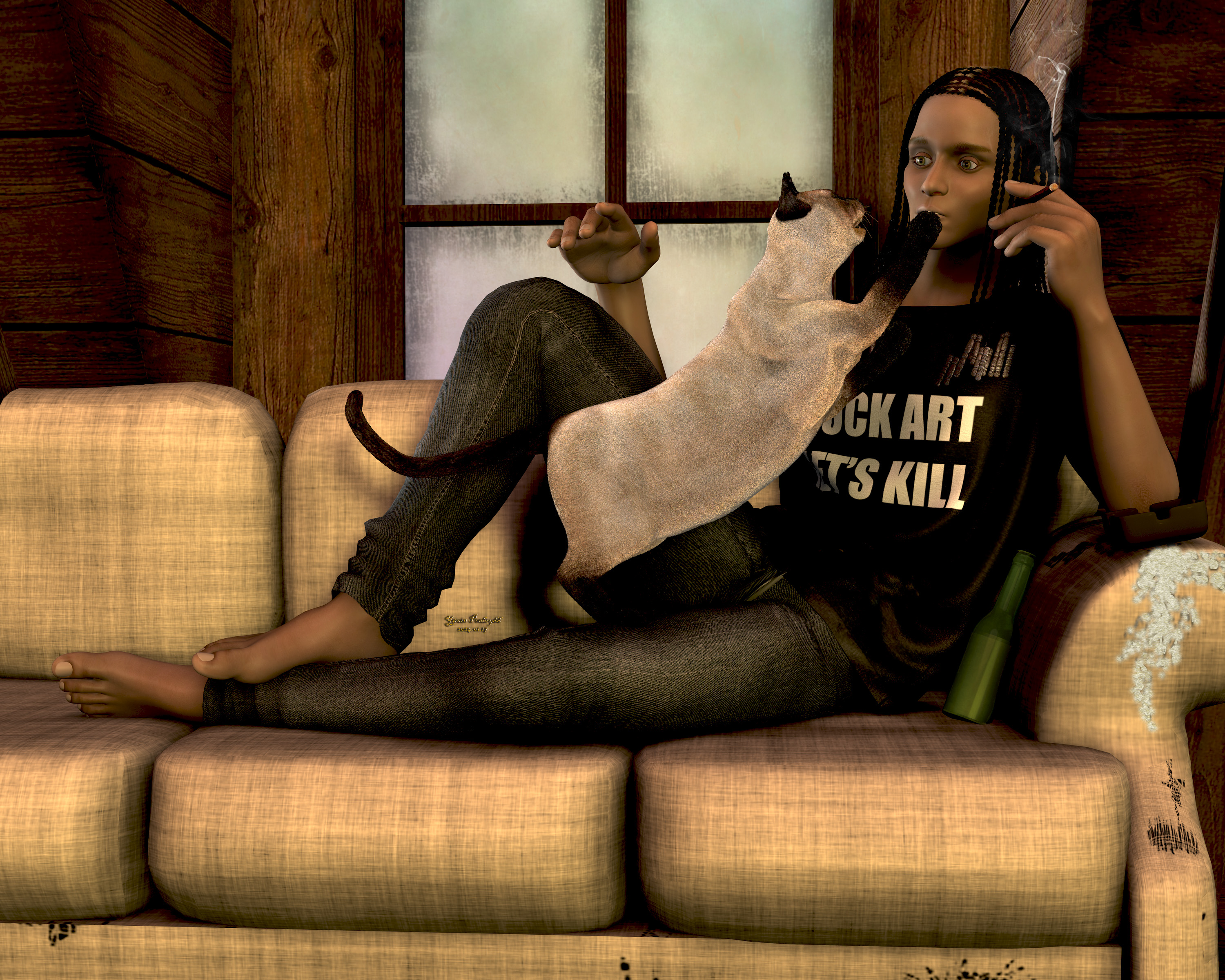 Notes: A cat would like to know why Certain Persons are not feeding him Tuna Nibbles. Haven would just like to finish the sentence they were in the middle of, when suddenly cat, without losing any blood. An artist would like to know how this image got lost for almost an entire year…